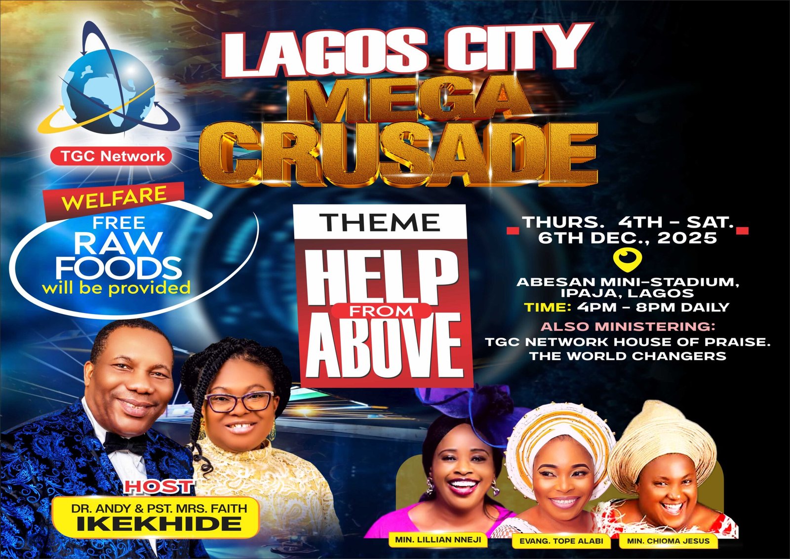 A 3days mega crusade starting Thursday 4th to Saturday 6th December, 2025, 4pm – 8pm daily at Abesan Mini Stadium, Ipaja, Lagos, Nigeria.